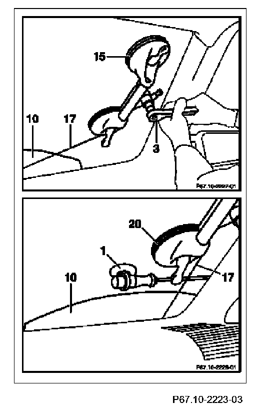 4.1 Cover areas adjacent to puncture point in vehicle interior with appropriate interior protection and pull cutting wire (17) approx. 70 cm into passenger compartment using awl (2).
