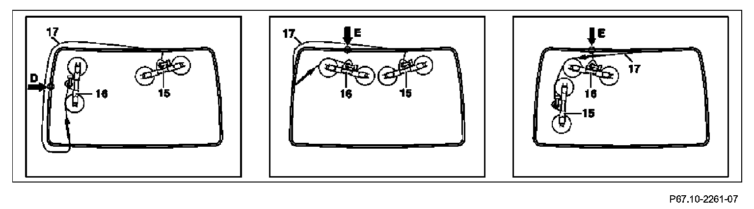 4.2 Mask off puncture point in area of drip rail with suitable textile tape and punch with awl (2) together with cutting wire (17) from outside through adhesive seam on rear window, remove cutting wire (17) from eyelet of awl (2) and pull approx. 70 cm into passenger compartment. Then remove awl (2).