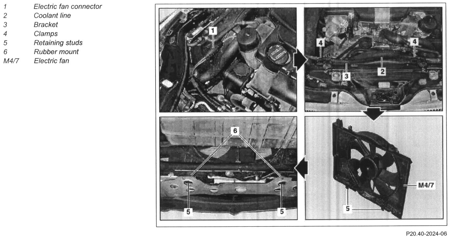 - Installation: The two retaining studs (5) of the electric fan must be located at the bottom in the rubber mounts (6).