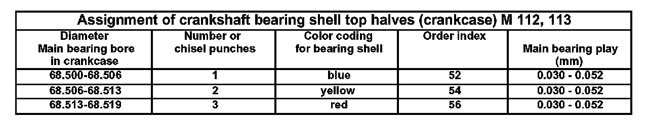Assignment of crankshaft bearing shell top halves (crankcase) M 112, 113: