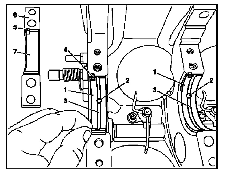 5 The thrust plates (8) are assigned to the bearing caps (6) using the numbers "1" and "0" (per the table). These are engraved on the journal of the crankshaft (arrowed).