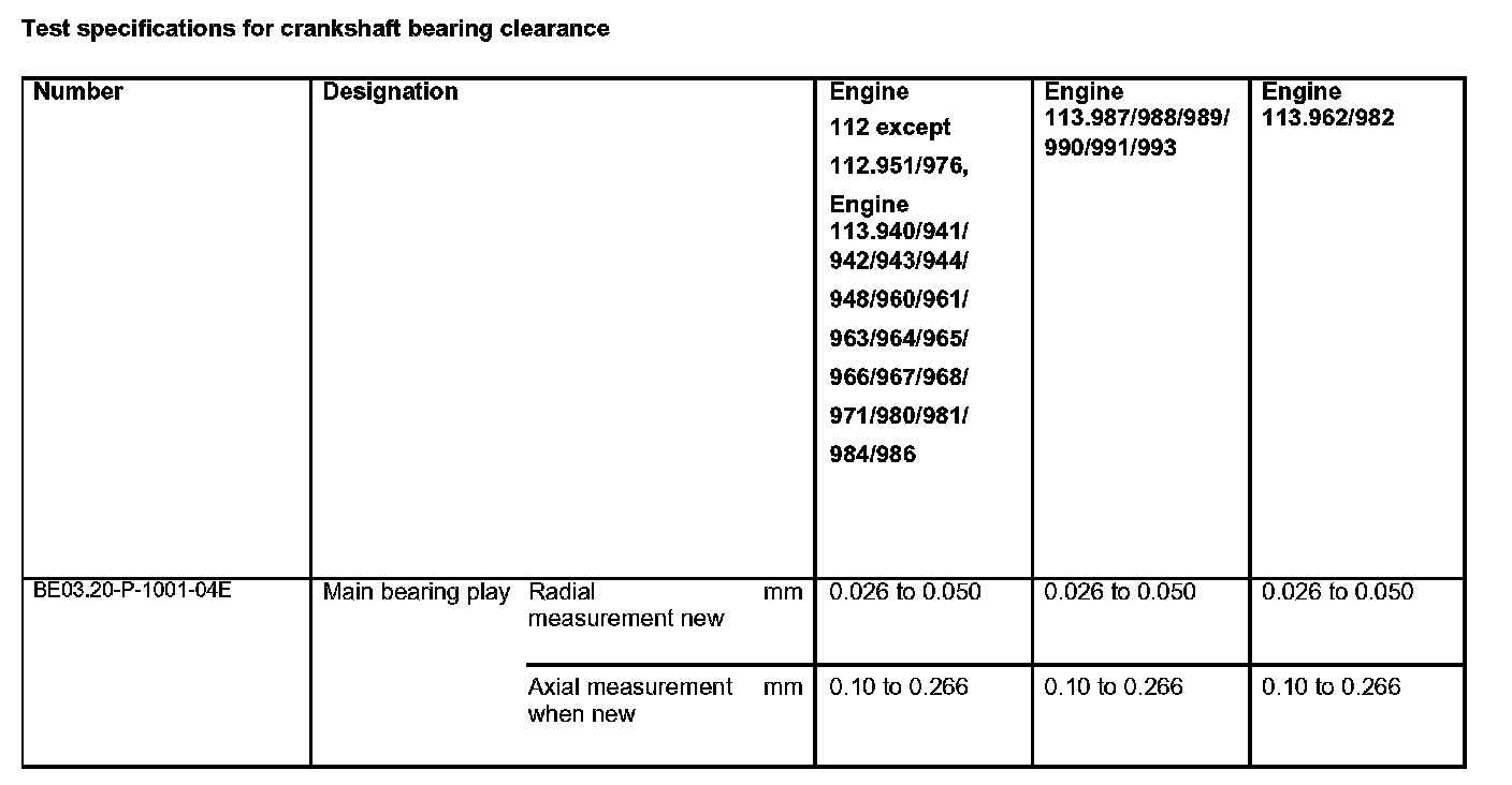 Test specifications for crankshaft bearing clearance: