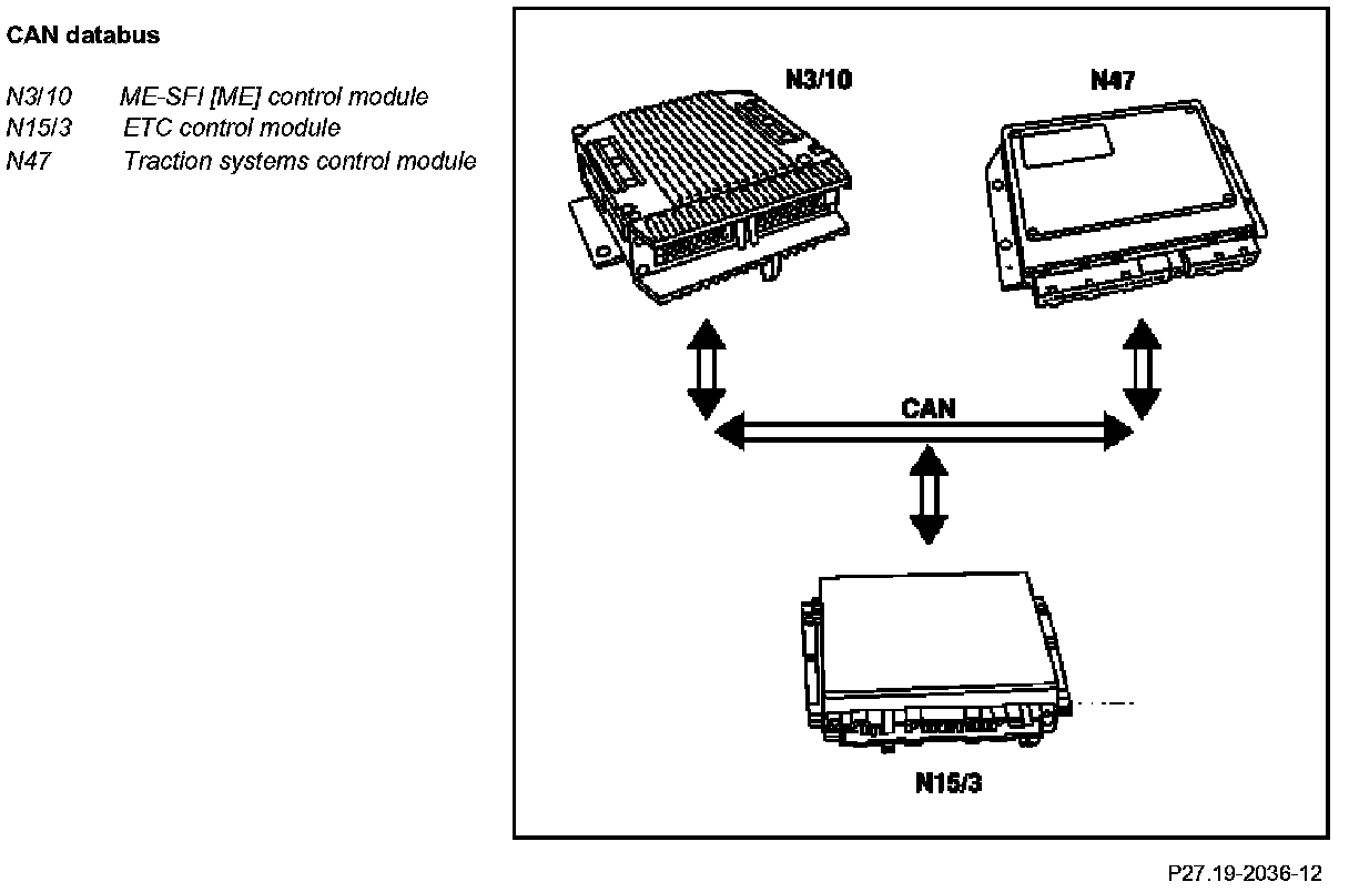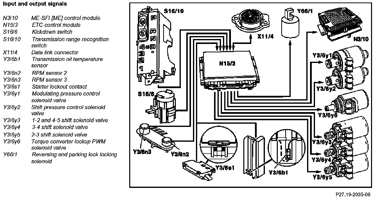 The ETC control module (N15/3) determines the instantaneous operating condition of the vehicle and controls all gearshift sequences taking into account the ease of shifting and the driving situation. This involves receiving, converting and transmitting various digital and analog signals.