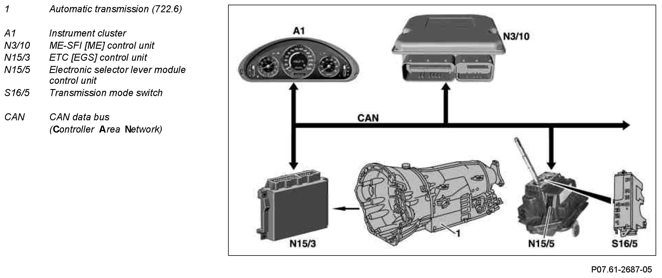 The information from the ETC control unit and the electronic selector lever module control unit is sent to the ME control unit via the CAN databus.