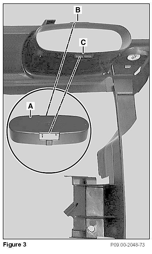 2. Remove cap (A, Figure 3), properly reinstall cap (A) by first locking the upper part of cap to the upper part of the air duct (B, Figure 2), then locking the lower part of the cap to the lower part of the air duct (C).