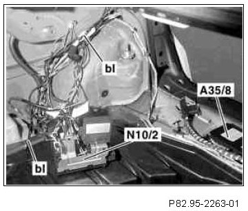 5 Guide single blue wire from the adapter wiring harness (1) along existing wires to the rear SAM control module with fuse and relay module (N10/2) and secure with tie straps.