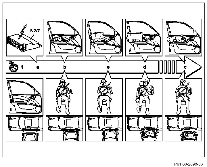 The restraint systems control unit (N2/7) checks the plausibility of the signal and if appropriate actuates the sidebags and the window bags at the affected side of the vehicle.
