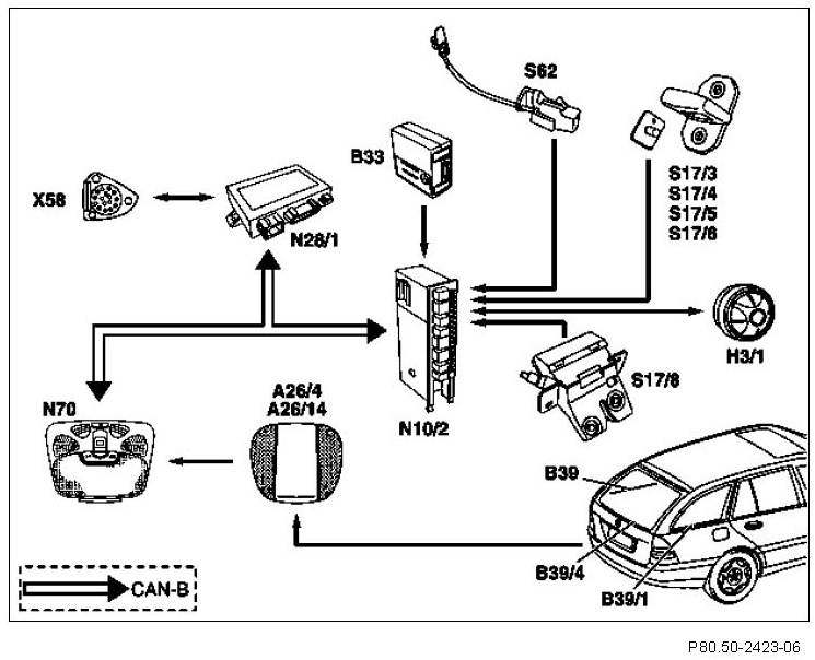 Alarm triggered (max. 15) and additional information, such as the window and tilting/sliding roof position, can be read out in the SAM control module with fuse and relay module (N10/2) and in the central gateway control module (up to 27.7.04) or in the EIS control module (as of 28.7.04) with STAR DIAGNOSIS.