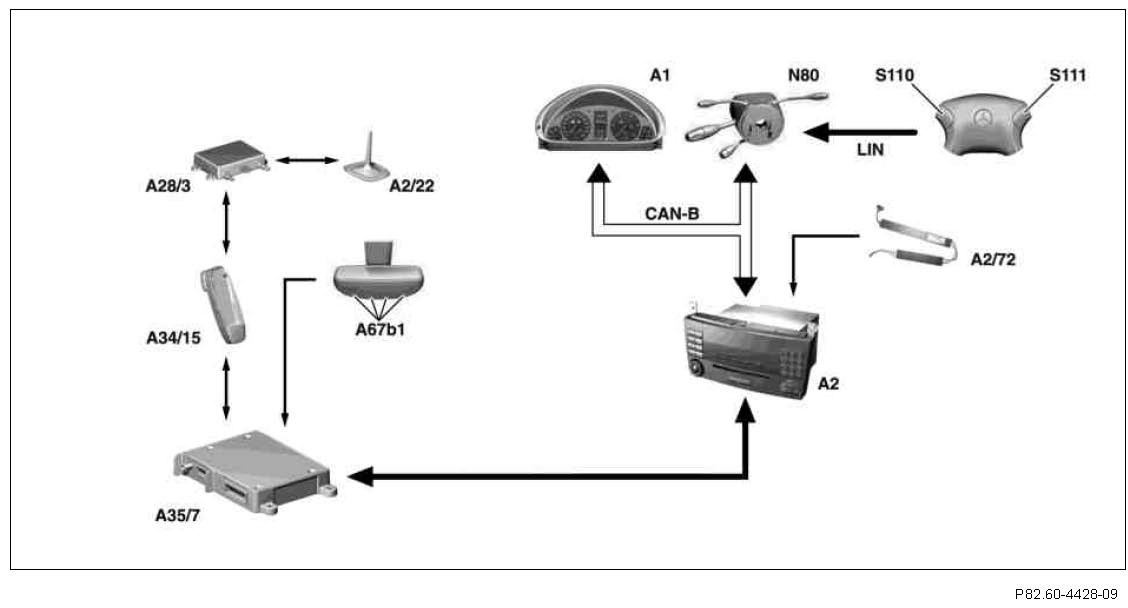After a request made via the radio (A2) the telephone radio signals are transmitted and received using the telephone antenna (A2/22). The signals are transmitted to the telephone interface control unit (A35/7) over the E-net compensator (A28/3). The E-net compensator (A28/3) has the task of compensating for losses caused by the higher transmission frequency of the E-net by means of amplification. The telephone is illustrated by a symbol, if it is operational, in the display of the radio (A2).