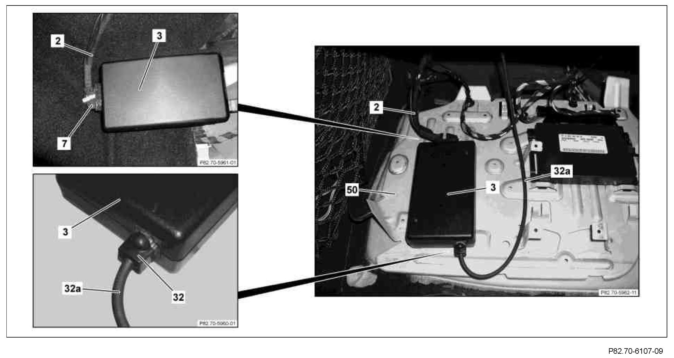 1 Contact telephone console (32) of wiring harnesses (32a) and connector interface (7) of the wiring harness FSE 12 (2) at the hands-free system interface (3).
