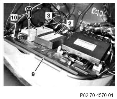 1 Place ICANI box (2) and interface box for hands-free system (3) on the front passenger footplate (9), mark hole pattern and drill to 2 mm dia.