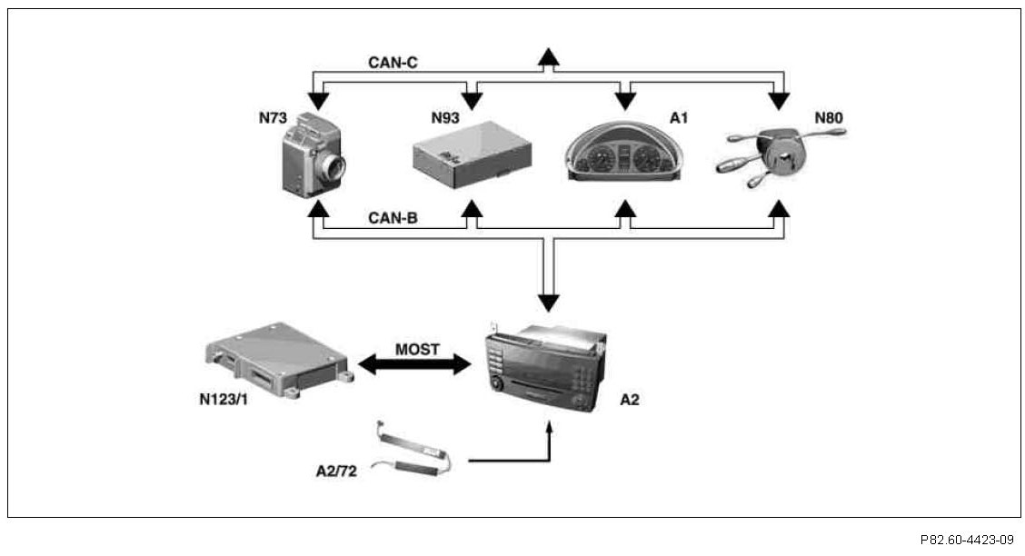 The amplifier module 2, window antenna (A2/72) and the amplifier module 3, window antenna (A2/73) receive frequency-modulated (FM) and amplitude-modulated (AM) high-frequency signals, filter the frequencies of the radio frequency bands and amplify them. The amplified signals are subsequently transmitted to the radio receiver via a coaxial cable.