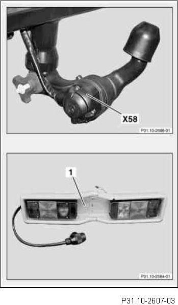 Check the function of the lighting signals at the 13-pin trailer hitch socket (X58) using a lighting bar (1), for example.
