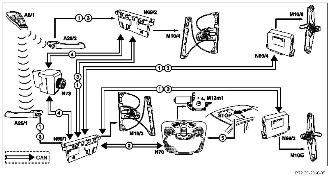 The corresponding control modules receive the CAN messages for convenience opening/closing and actuate the required motors. The motors remain actuated for as long as the button on the transmitter key is pressed, though for no longer than 25 s.