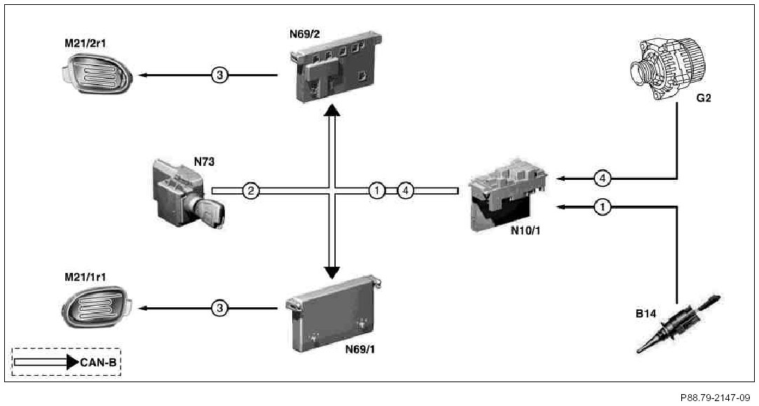 The left front door control module (N69/1) and right front door control module (N69/2) act as the power supply and control regulated switch-on and switch-off of the heating resistors. The left front door control module (N69/1) and right front door control module (N69/2) receive for this purpose a CAN-B (CAN-B) message from the front SAM control module with fuse and relay module (N10/1).