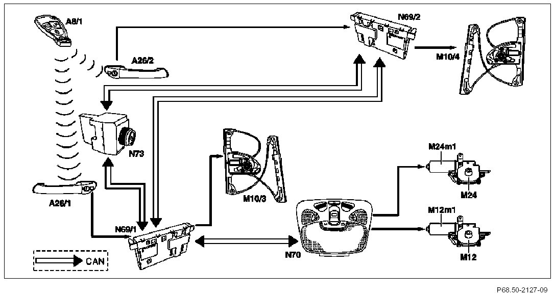 The transmitter key (A8/1) sends an infrared signal to the left front IR receiver (A26/1) or the right front IR receiver (A26/2). The overhead control panel control module (N70) receives the request for "convenience opening" via CAN and actuates the sun blind motor (M24m1) in the "open sun blind" direction. This opens the panoramic sliding roof sun blind.