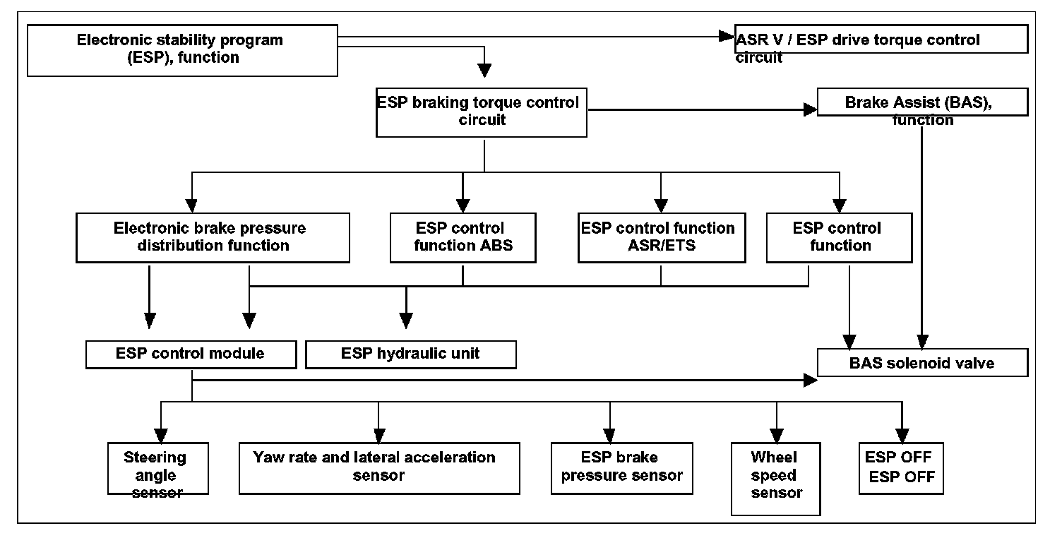 The motor electronics are used to adjust the drive torque. This system controls the engine by regulating the throttle valve and the firing point. The gear stage of the electronic transmission control (EGS) is also evaluated for calculating ESP drive torque control. The ABS and ASR and BAS functions are included in the ESP electronics of the brake control.
