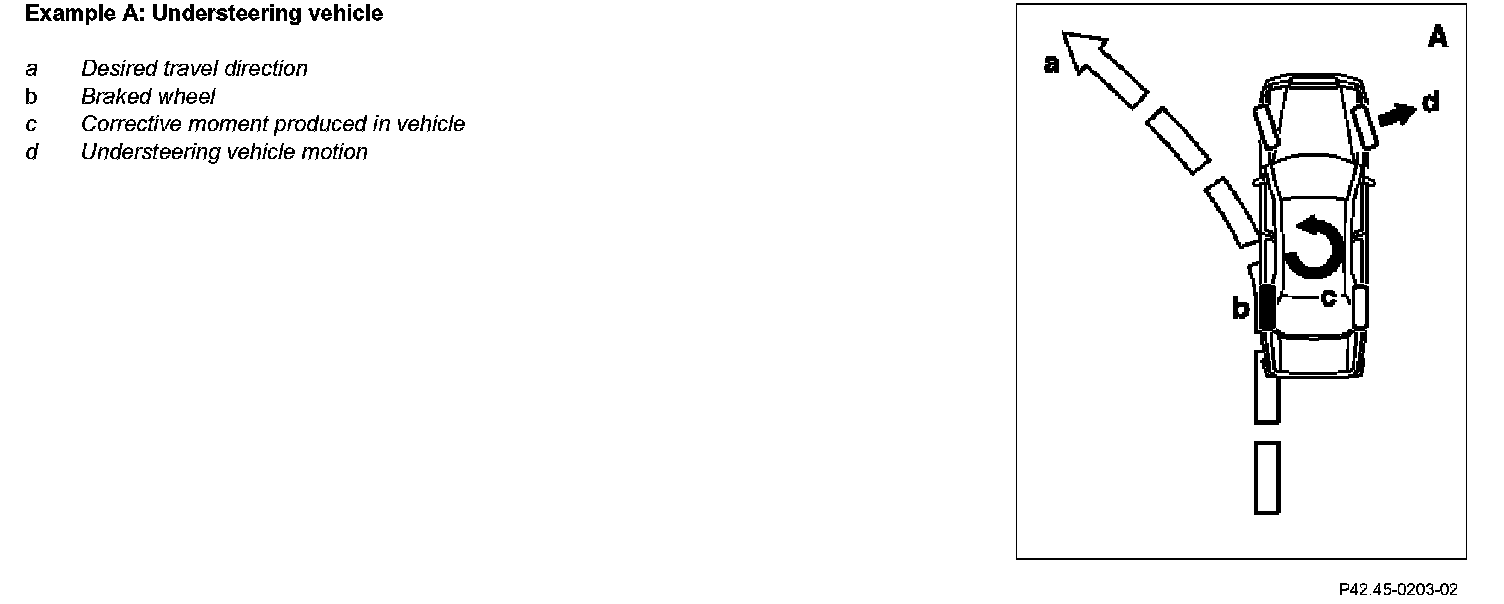 If oversteer or understeer is detected, a calculated brake intervention is carried out at the front and rear axle via the ESP and BAS control unit (N47-5) and traction system hydraulic unit (A7/3). This braking action deliberately counteracts the undesirable vehicle motion. Through a signal via the engine compartment CAN (CAN-C) to the motor electronics control unit (N3/10) or CDI control unit (N3/9) the drive torque reduction to suit the requirements is achieved by an engine torque reduction.