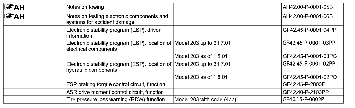 The antilock brake system (ABS) prevents the wheels from locking up when braking and as a result maintains the steerability and directional stability and road adhesion during vehicle deceleration. The acceleration slip regulation (ASR) prevents the drive wheels from spinning while driving. In addition they result in improved directional stability and road adhesion for increased traction potential over the entire vehicle speed range. Engine braking regulation (MSR) reduces the wheel slip of the drive wheels in overrun mode and ensures directional stability and road adhesion. The Electronic Stability Program (ESP) prevents breakaway when the vehicle oversteers or understeers. In all situations it ensure that the vehicle does not deviate from the course specified by the driver (within physical limits). Brake forces are produced selectively at the individual wheels to correct this. The tire pressure loss warning (RDW) prevents run-flat damage to the tire. It detects pressure loss via a comparison of wheel rpm and shows it in the multifunction display (A1p13). Tire pressure loss warning (RDW) is a pure software constituent of the ESP and BAS control unit (N47-5) (model 203) with CODE (477) tire pressure loss warning.