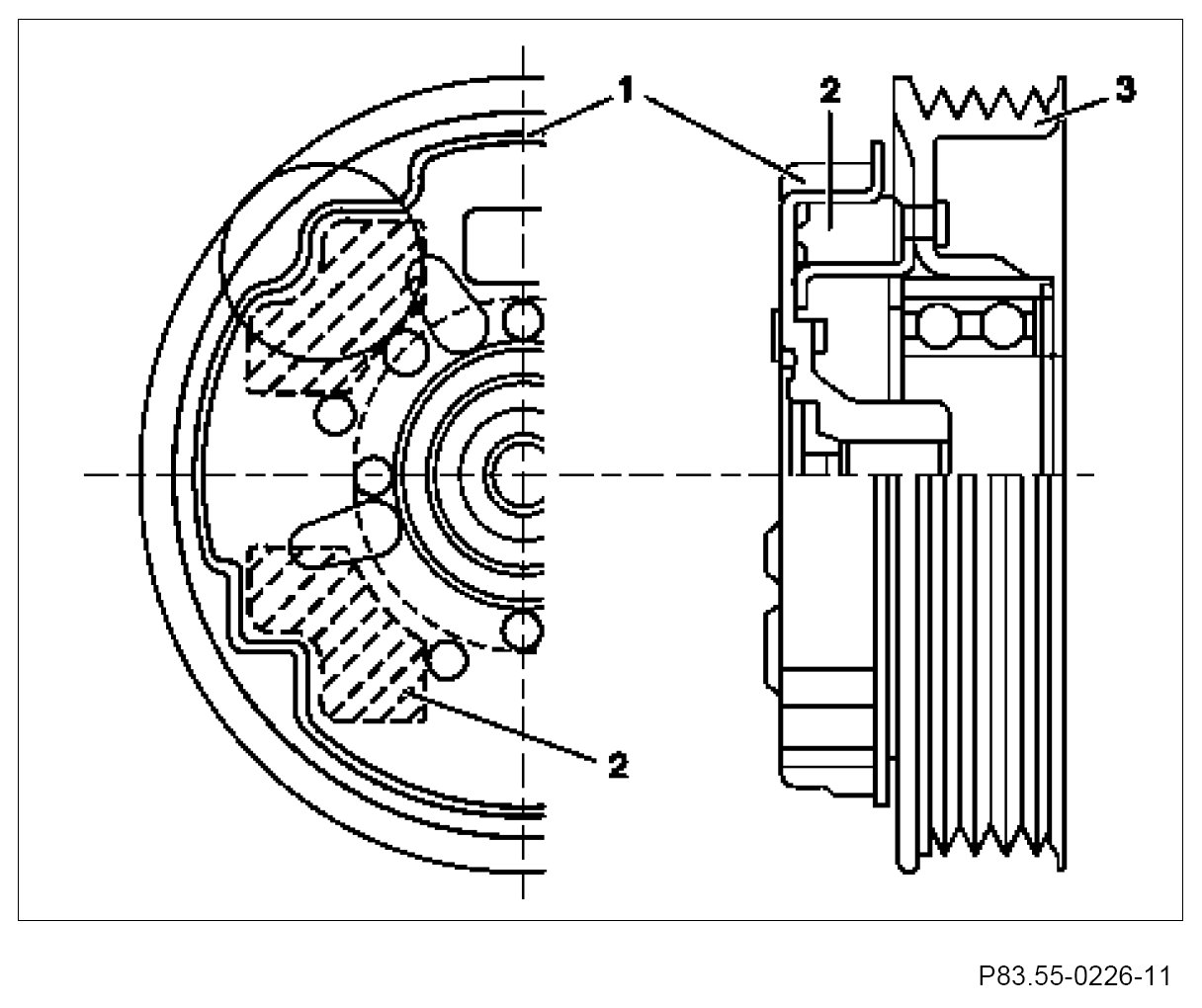 The belt pulley (3) is attached to the hub (1) via the rubbers (2) , the hub (1) being firmly connected to the refrigerant compressor shaft.