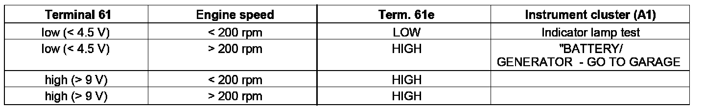 The circuit 61e CAN message can have the status "HIGH" or "LOW". It is "LOW" precisely when the voltage which is applied to circuit 61 is < 9 V and the engine speed is < 200 rpm. In all other cases the message status is "HIGH".
