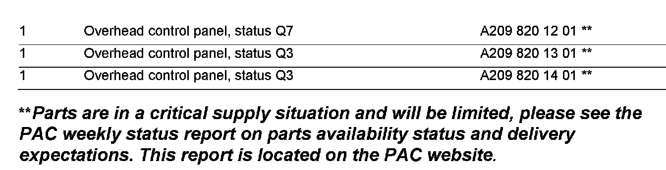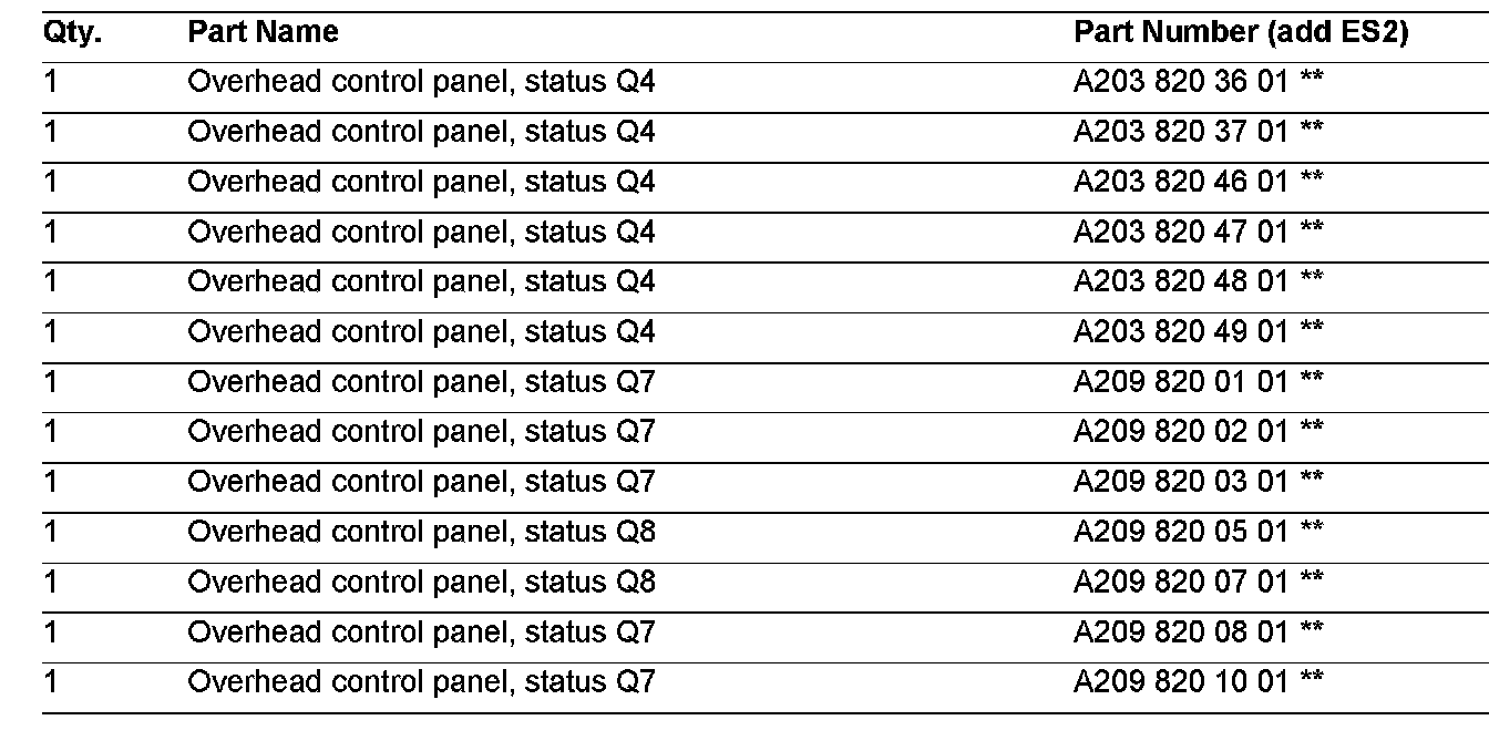 If you receive customer reports in the above model vehicles that the interior dome light not illuminate, this may be due to a time out error in the Overhead Control Panel (OCP / N70). The "time out" time has been increased in the OCP with the below indicated Q-status level. To resolve, using SDS verify the OCP installed has a Q-status lower than the parts listed below. If the OCP has a lower Q-status, replace the OCP. If the Q-status is equal to or higher, further diagnosis is required. Follow AR82.20-P-1000P for 203, AR82.20-P-1000Q for 209.3 or 82.20-P-1000QA for 209.4 for removal/installation instructions.