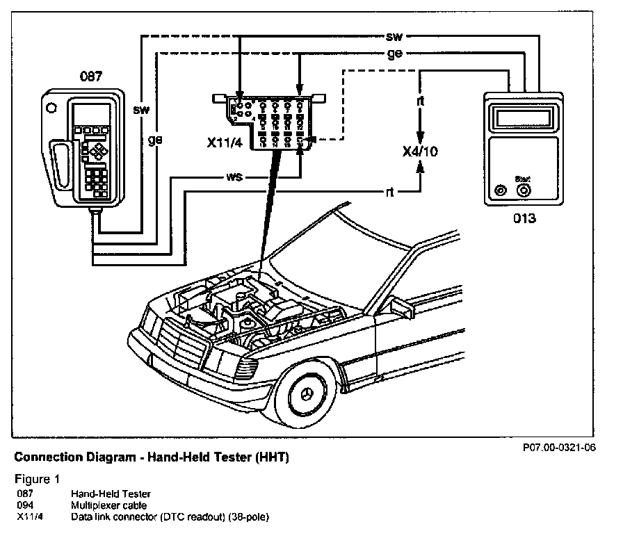 3. Connect HHT (087) with test cable (097) to data link connector (X11/4). Readout DTC fault codes.