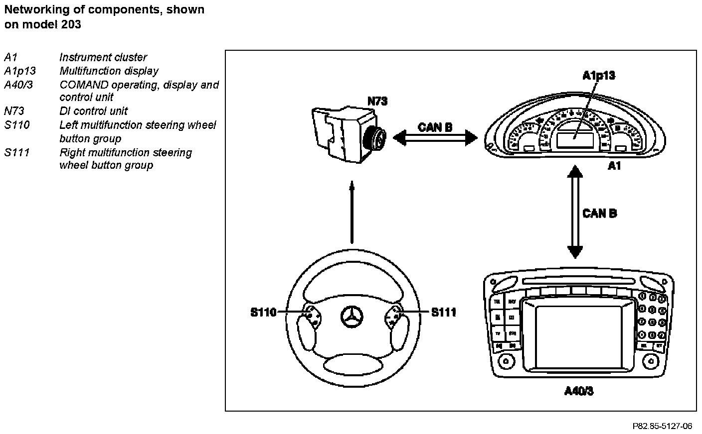 The total data exchange between the instrument cluster (A1) and the COMAND operating, display and control unit (A40/3) is performed over the Controller Area Network bus Class B (interior) (CAN-B).
