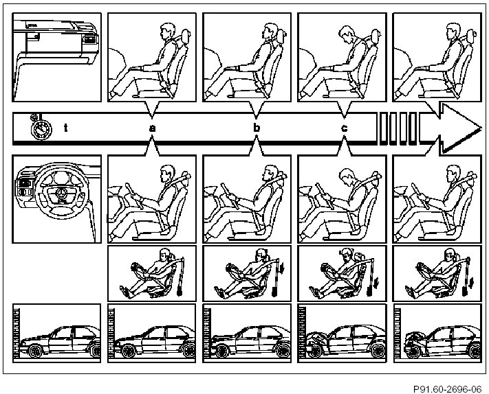 The illustrations show the chronological triggering sequence of the emergency tensioning retractor with a moderately severe head-on collision or the triggering of the emergency tensioning retractor and the airbag with a severe head-on collision. The times that are specified are merely intended to show the short duration of the airbag inflation and deflation procedure and the triggering of the emergency tensioning retractor.