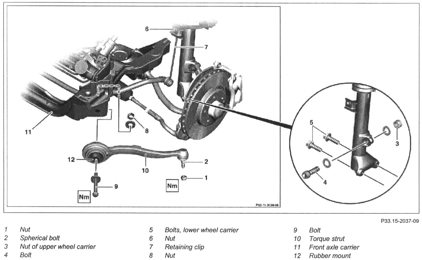 12 Pry off torque strut (10) with assembly lever out of the front axle carrier (11) and remove