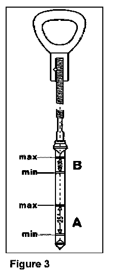 7. Remove breakaway locking tab from dipstick and check fluid level; the fluid level must be between the min and max marks (A, Figure 3).