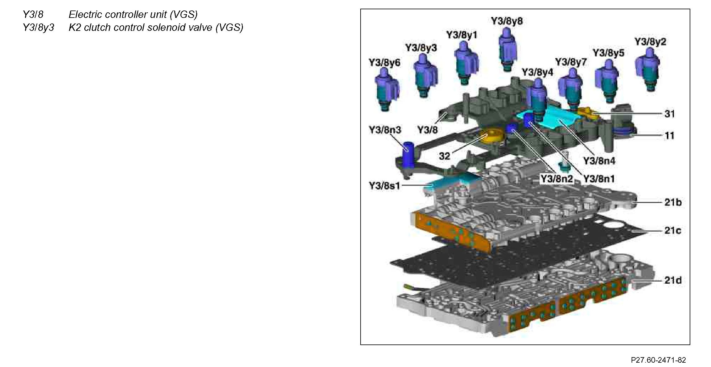 The clutch control solenoid valve K2 (VGS) (Y3/8y3) is actuated by the fully integrated transmission control unit (VGS) (Y3/8n4) and influences the position of the regulating valve K2. The pressure in the multidisk clutch K2 depends on the regulating valve position and therefore on the geometry of the regulating valve K2