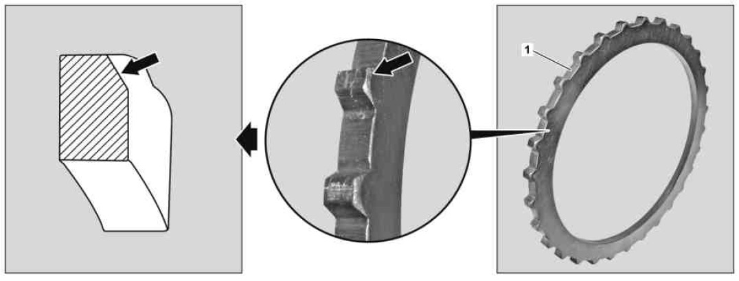 As of 05/07, the end disk (1) in the multidisk brakes BR, B2 is to be modified. The new end disk (1) can be identified by the punched indent on one side (rounded edge on one side of the outer edge of the end disk (1)) (arrow). As a result, grinding is no longer required at this end disk (1).
