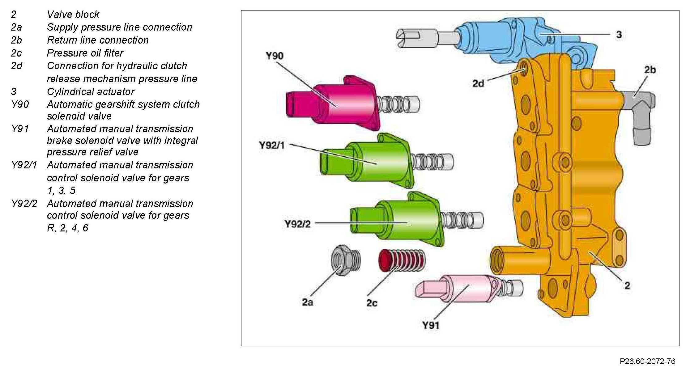 The oil (Pentosin) supplied by the hydraulic pump is delivered to the valve block (2) through a steel line. The oil passes through a pressure oil filter (2c) and via a check valve direct to the automated manual transmission clutch solenoid valve (Y90), the automated manual transmission control solenoid valve for gears 1, 3, 5 (Y92/1), the automated manual transmission control solenoid valve for gears R, 2, 4, 6 (Y92/2) and the automated manual transmission brake solenoid valve (Y91).