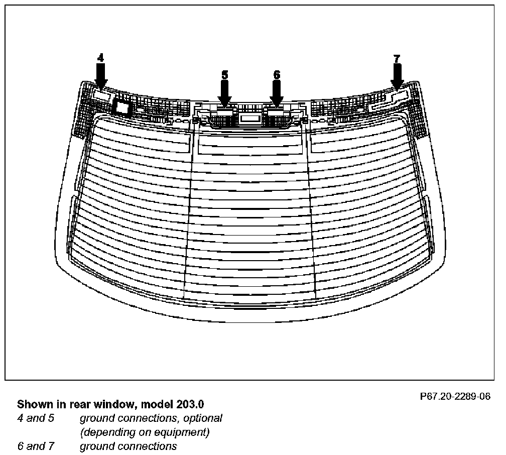 On vehicles with present ground connections (6, 7) or optional ground connections (4, 5) between the rear window and the body, do not coat cutouts (arrows) with primer, e.g. from repair kit.