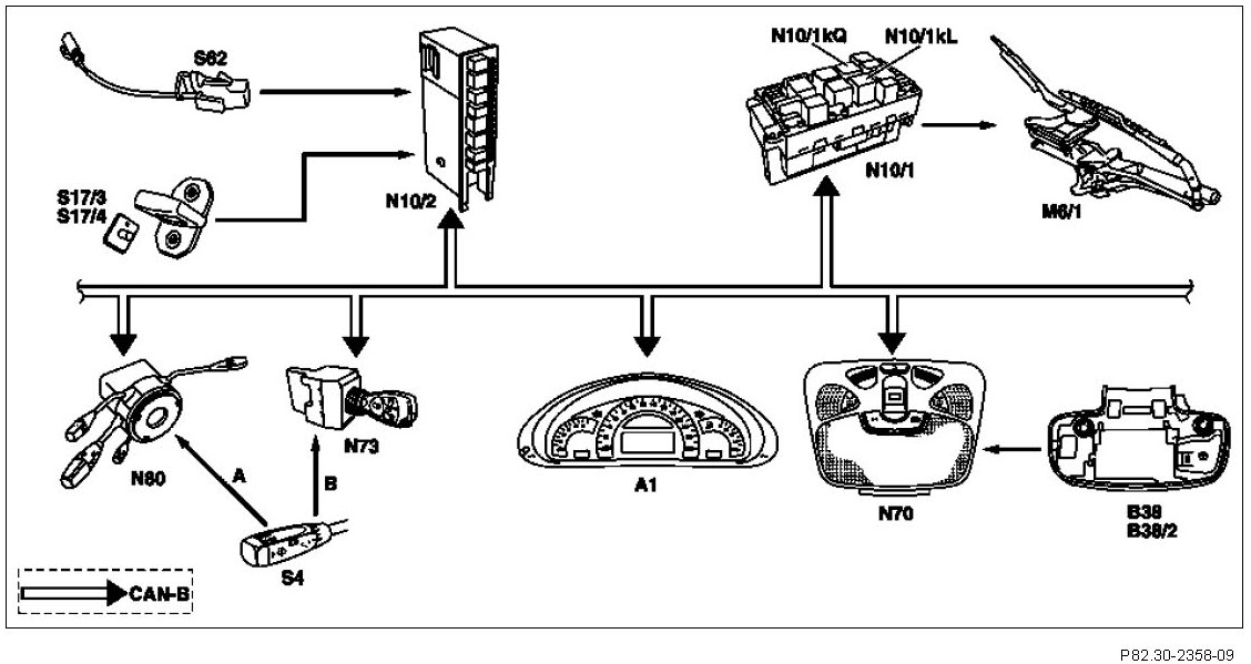 The data exchange between the front SAM control unit with fuse and relay module (N10/1) and the rain sensor (B38) or the rain/light sensor (B38/2) takes place via the CAN-B. The overhead control panel control unit (N70) serves as interface.