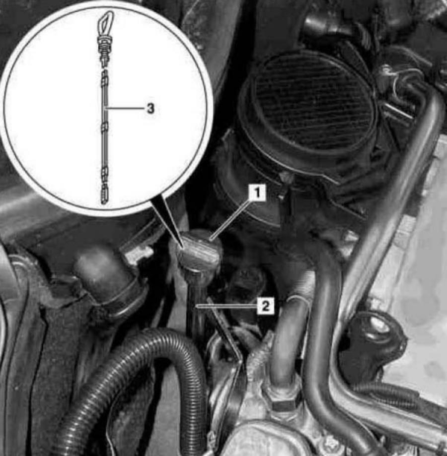 2. Insert dipstick (3) into the oil dipstick guide tube (2).