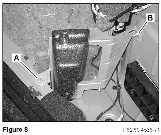 2. In the right side trunk well, remove the amplifier bracket-or amplifier assembly, if so equipped-by removing the 8-mm bolt (A, Figure 8) and 8-mm collar nut (B, Figure 8).