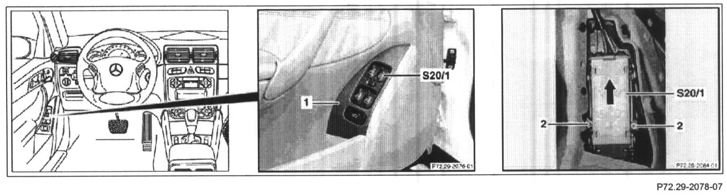 3 Unclip left front power window switch group (S20/1) out of trim panel (1) (arrow) and remove