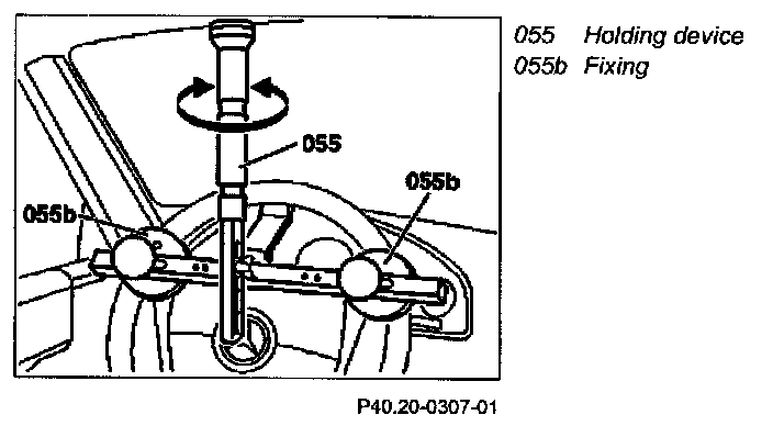 CAUTION: Otherwise the driver's seat and steering wheel move to a different position, e.g. when the driver's door is opened or closed. The upper frame may be damaged when the retainer (055) is installed.