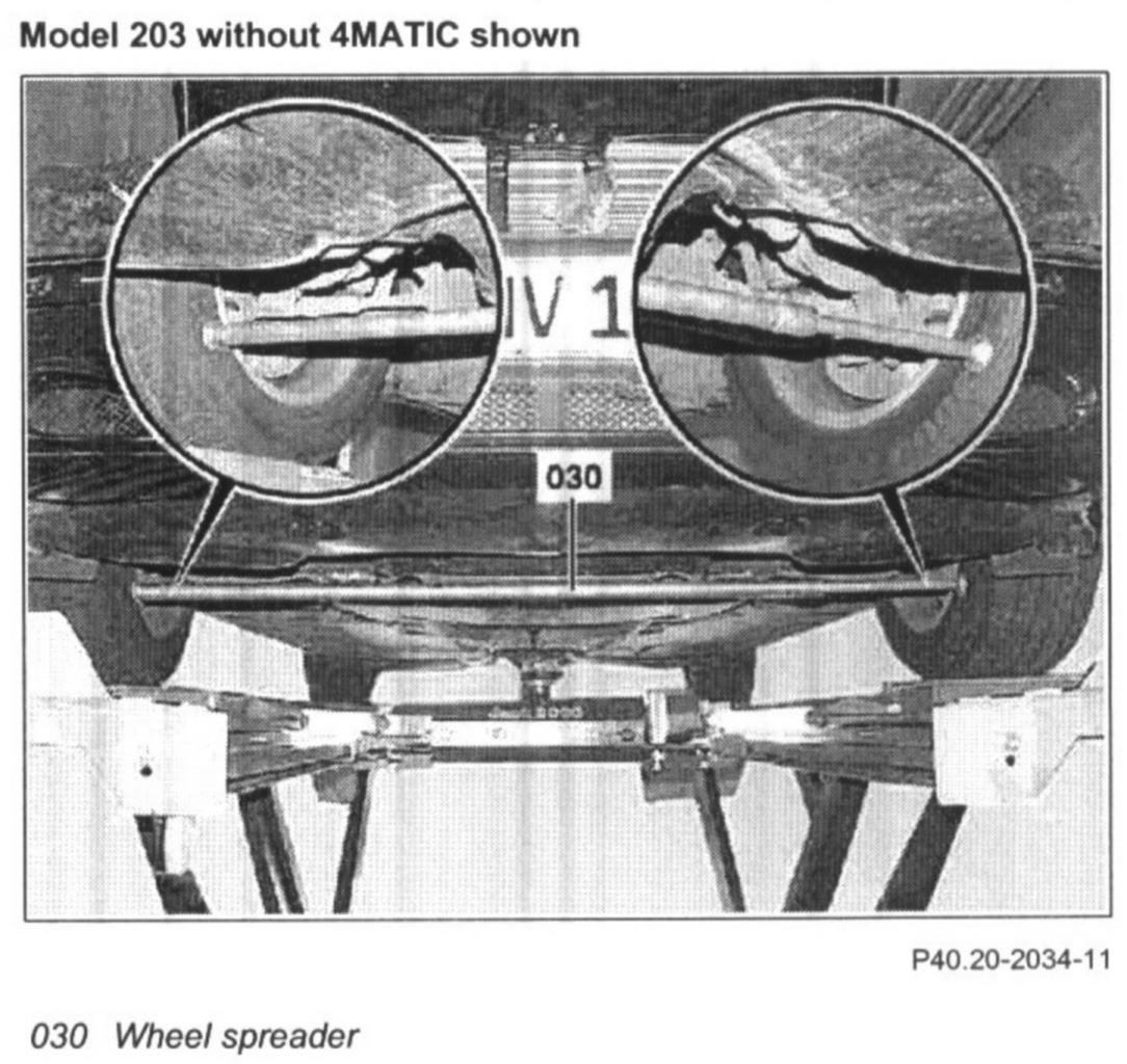 NOTE: The elastic bearings of the cross strut, torque strut or lower transverse control arm and steering linkage produce a correspondingly large toe value which is reduced to the correct dimension in the curb condition.