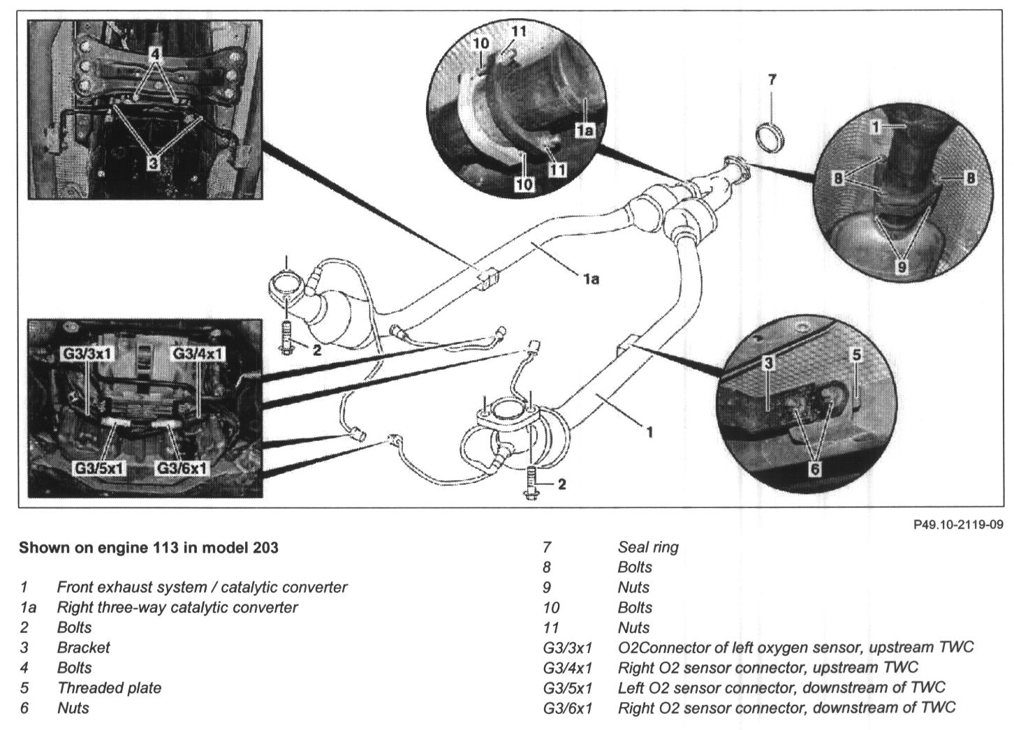 NOTE: Installation: Use emery cloth to remove combustion and corrosion residues at connection points. Install right three way catalytic converter (la) free of tension.