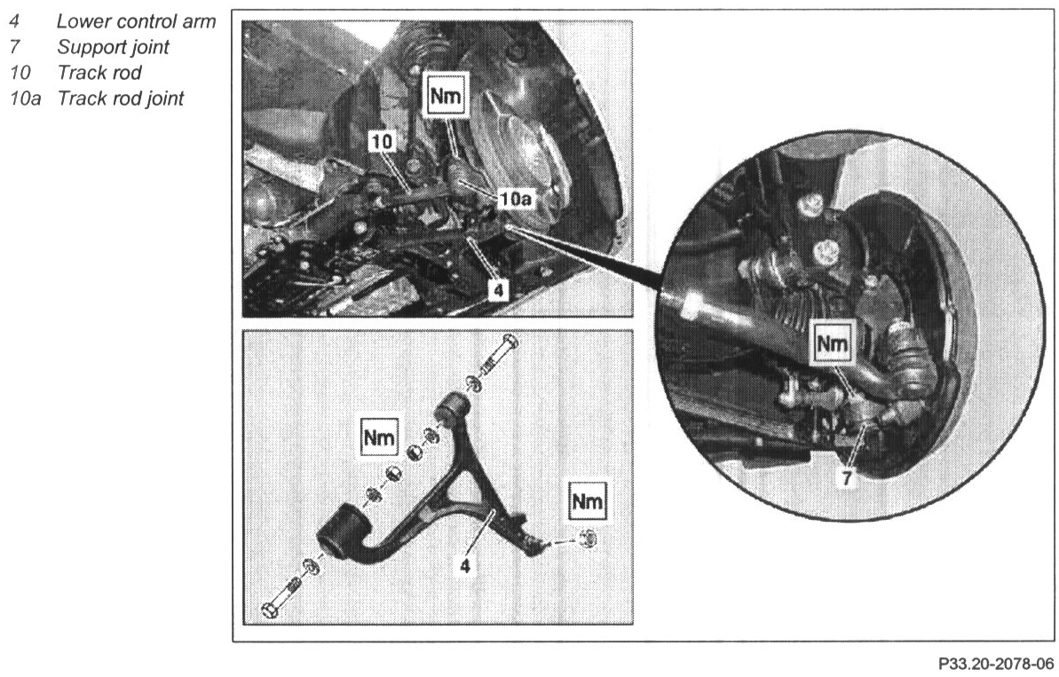 - If damaged the lower control arm (4) must and support joint (7) be replaced.