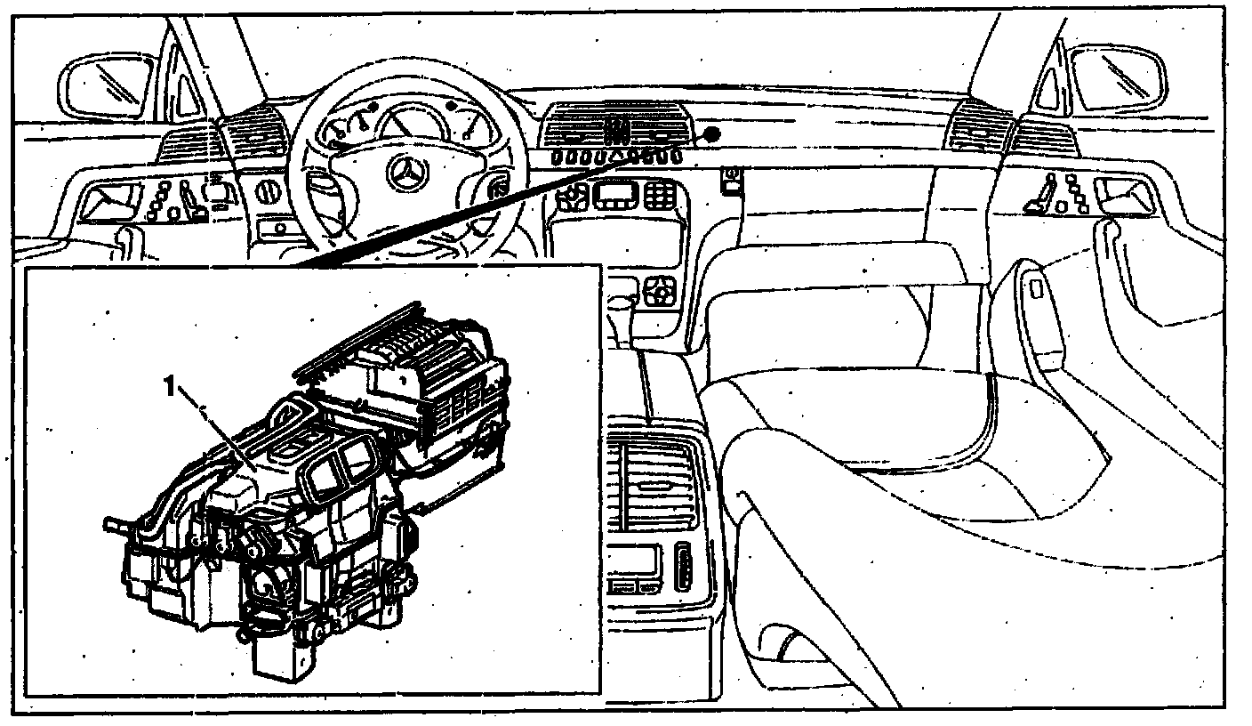 The automatic air conditioning housing (1) is located below the instrument panel.