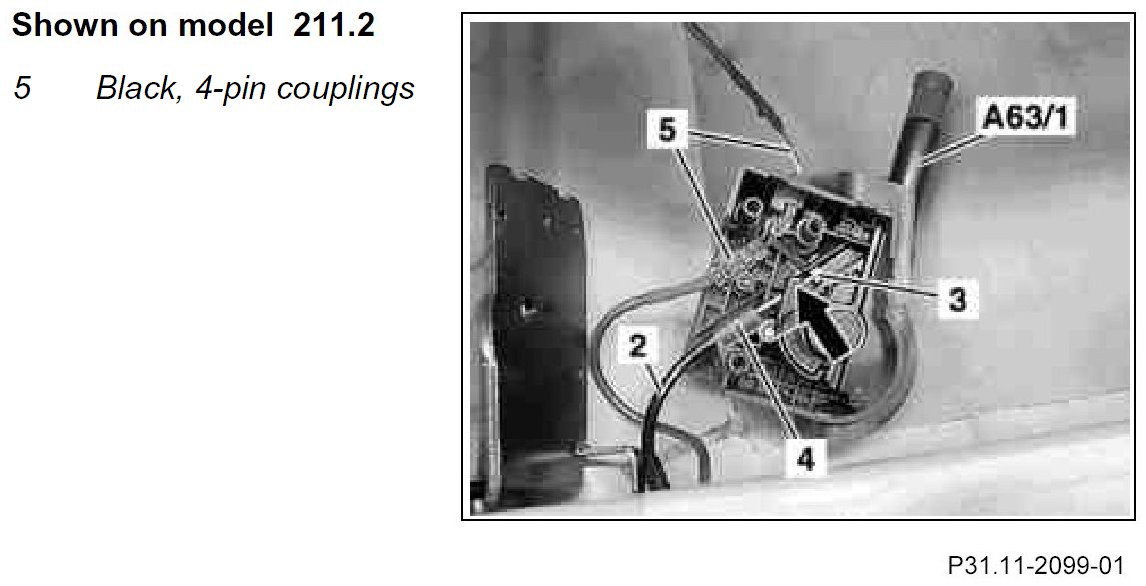 1. Remove cable (2) from the cable guide (4) on the trailer connection unit control panel (A63/1) and unhook cable end stop (3) from the cutout (see arrow) of the trailer connection unit control panel (A63/1).