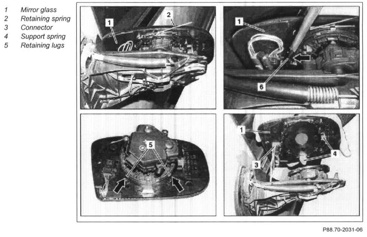 NOTE: Installation: Hook in mirror glass (1) at bottom first with retaining lugs (5) in retaining recesses (arrows) on drive. Observe support springs (4).