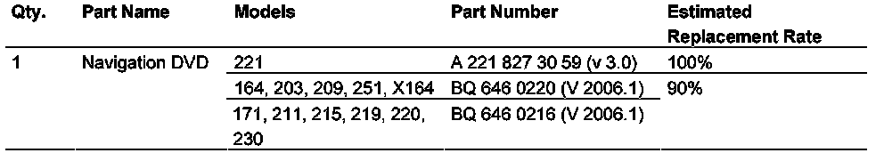 1. Models 171, 211, 215, 219, 220, 230: Check part number of Navigation DVD in vehicle.