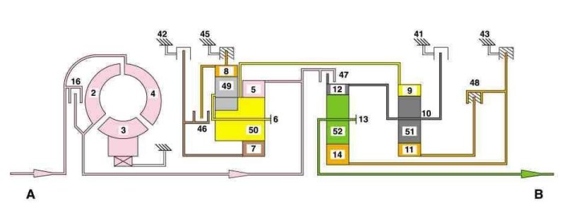 The ring gear (9) rotates at the same speed due to the mechanical connection to the dual planet carrier (6). The planetary gears (51) roll over the stalled sun gear (11) and transmit the rotary motion to the planet carrier (10).
