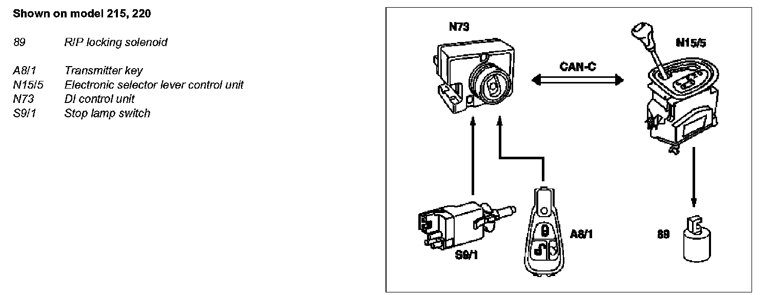 Upon receipt of a valid drive authorization code from the electronic ignition switch control unit (N73) via the Controller Area Network bus Class C (engine compartment) (CAN-C), the electronic selector lever module control unit (N15/5) actuates the R/P blocking magnets (89) when the brake pedal is pressed and therefore the stop lamp switch is actuated (S9/1). The signal from the stop lamp switch (S9/1) which has been operated is likewise conveyed to the electronic selector lever module control unit (N15/5) via CAN-C. The R/P locking magnet (89) releases the selector lever thus allowing the selector lever to be moved away from position "P".