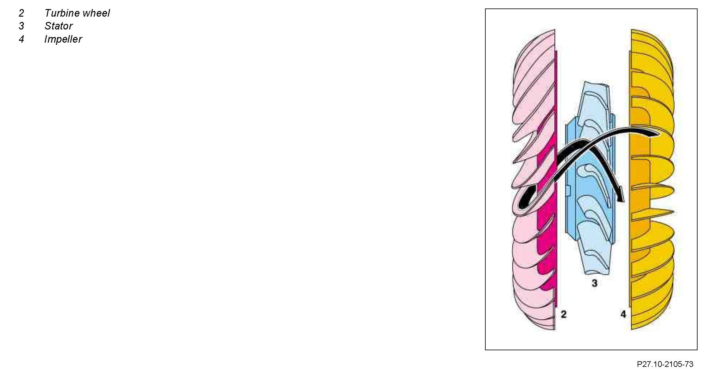 The impeller (4) is connected to the engine and turbine wheel (2) is connected to the transmission input shaft. The stator (3) is connected to the transmission housing via a freewheel and the stator shaft.